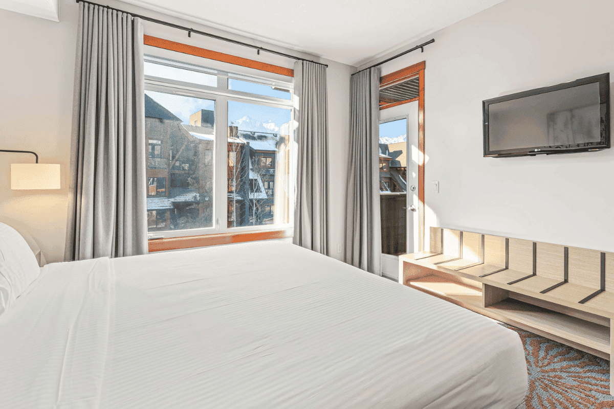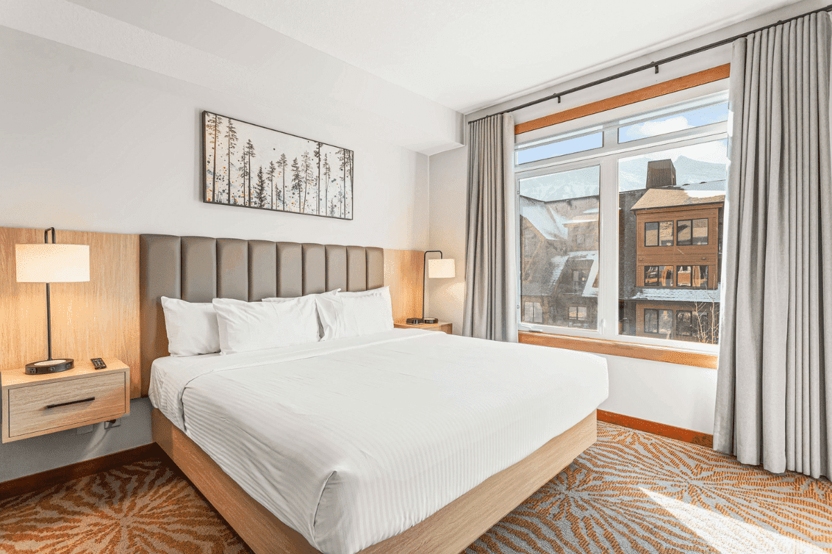 This gorgeous two bedroom Hydeaway is located in the very popular Blackstone Mountain Lodge, offering a year-round outdoor pool, 2 hot tubs, heated underground parking complete with EV charging stations, a well equipped fitness room, and much more! Cougar Creek Hydeaway is located at the very end of the hallway, which adds to its wonderful feeling of seclusion and privacy. Toss in the beautiful view of the iconic Three Sisters and you have the makings of a perfect Hydeaway for you and your friends or family! Upon arrival, the suite immediately opens up into the kitchen, living, and dining area, with the south facing bedrooms on either side of the living room. Each bedroom has direct access to the balcony that comes with a table and seating for four all constructed from recycled plastics. In-suite dining is a cinch with the fully equipped kitchen and lovely dining, and accompanied by barstool seating at the kitchen counter. If you are looking to BBQ, there are guest facilities right next to the pool where you can chat with fellow travelers or enjoy a beverage while you cook. After travelling for a while, laundry adds up! Freshen up even in the middle of a trip with the new stacked washer/dryer with complimentary detergent. Relax in front of the fireplace and enjoy some R&R in front of the big screen TV or enjoy extra sleeping space with the convenient pullout sofa. Whatever your needs, couples golf trip, family getaway, wedding weekend, hiking, or skiing in the mountains, this is the Hydeaway for you!